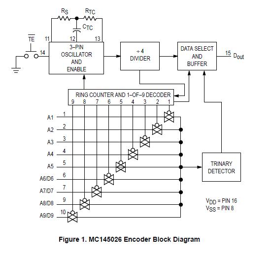 The MC145026P is a encoder/decoder pair in remote control applications. The MC145026P encodes nine lines of information and serially sends this information upon receipt of a transmit enable (TE) signal. The nine lines may be encoded with trinary data (low, high, or open) or binary data (low or high). The words of the MC145026P are transmitted twice per encoding sequence to increase security.